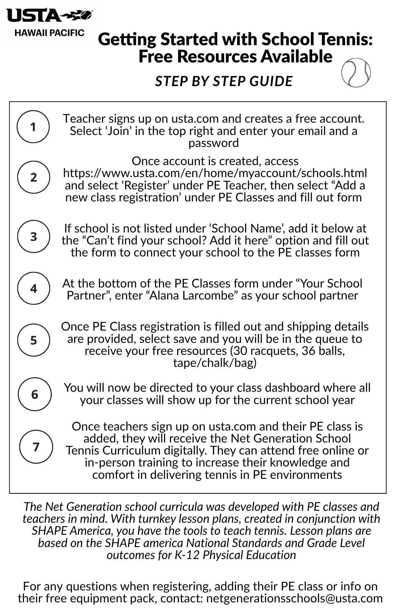 Interested in bringing tennis to your school? Please reach out to Alana Larcombe at larcombe@hawaii.usta.com to find out how!